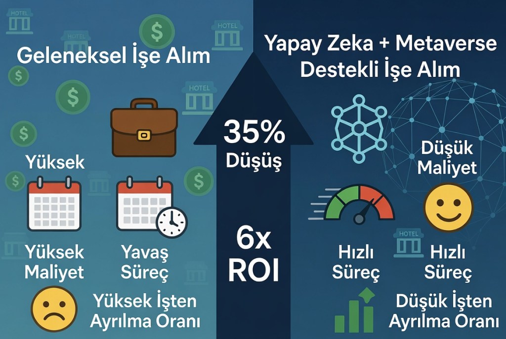 Otel işletmelerinde işe alım süreçlerinde verimlilik, sadece teknolojik bir hız kazanımı değil, aynı zamanda karakter ve kurum kültürü uyumunun veriyle doğrulanmasıdır. Geleneksel modellerin sunduğu “içgüdüsel” kararlar, %70-80 oranındaki turnover krizini beslemeye devam etmektedir. Buna karşın, Turizm 5.0 perspektifiyle harmanlanmış Metaverse ve Yapay Zekâ entegrasyonu, işe alımı bir maliyet kalemi olmaktan çıkarıp ölçülebilir bir yatırım getirisi (ROI[a1] ) sağlayan stratejik bir güce dönüştürmektedir. Adayların sanal ortamda performans sergilediği, mekân sınırlaması olmayan bu yenidünya, işletmelere küresel bir yetenek havuzuna erişim imkânı verirken, yanlış işe alımların yarattığı devasa finansal kayıpları minimize etmektedir.
