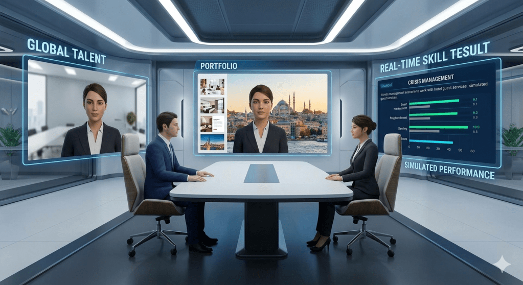 - Simüle Edilmiş İş Görüşmeleri: İK profesyonelleri, adayları sanal bir ön büro veya mutfak simülasyonuna dâhil ederek; kriz anı yönetimi, yabancı dil yetkinliği ve protokol bilgisini canlı senaryolar üzerinden test edebilir.