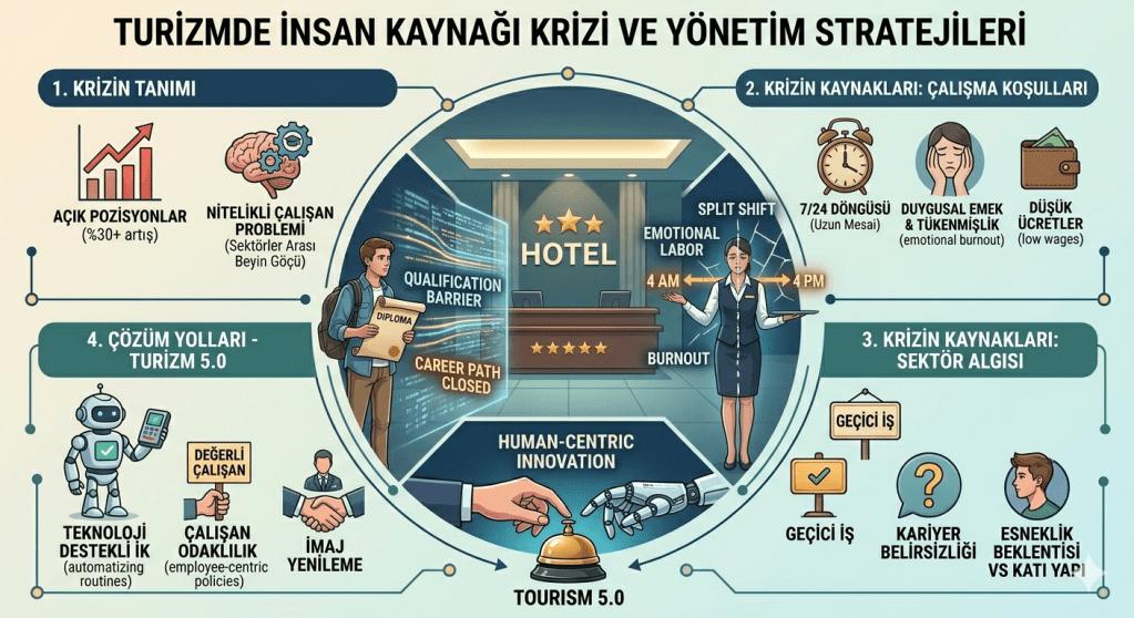 This study examines the chronic human resources crisis in the tourism industry within the framework of the decline in labor supply, loss of qualified personnel, and negative sectoral perception. In today’s increasing global competition, the biggest challenge for tourism enterprises is not physical capacity, but a sustainable employment model. The article analyzes the sources of the crisis and synthesizes the solution proposals in the literature.