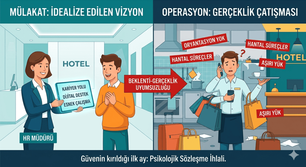 Adayların işe alım sürecinde karşılaştıkları “idealize edilmiş” imaj ile operasyonel gerçeklik arasındaki fark, “hayal kırıklığı” (disappointment) etkisine yol açmaktadır. Çalışan, mülakatta vadedilen kariyer yolunun veya çalışma koşullarının sahada karşılık bulmadığını gördüğünde psikolojik sözleşmesini tek taraflı olarak feshetmektedir (Koç & Uşaklı, 2022).