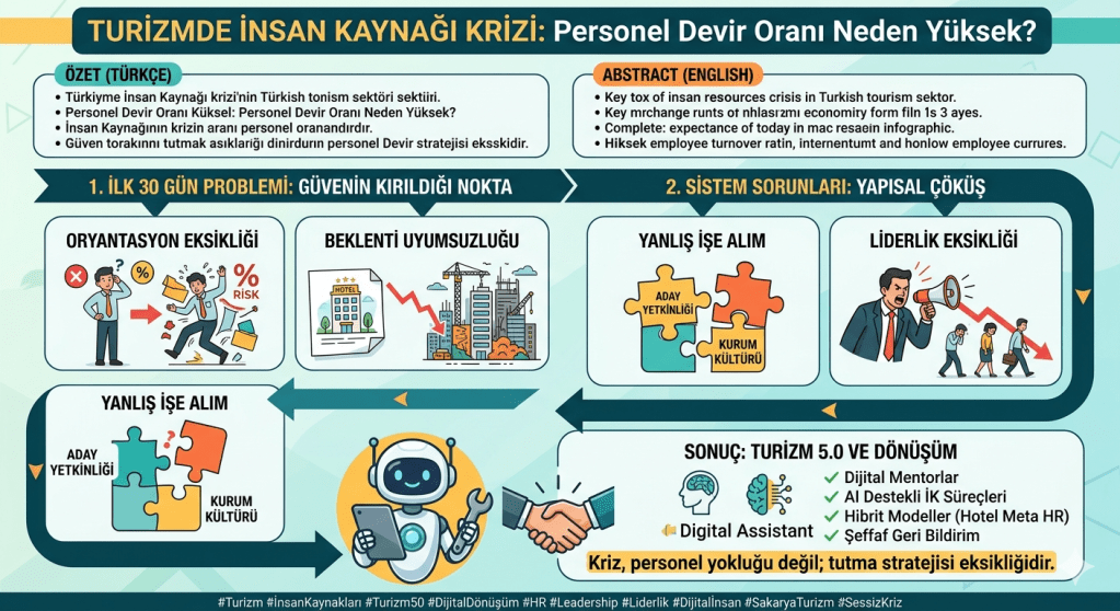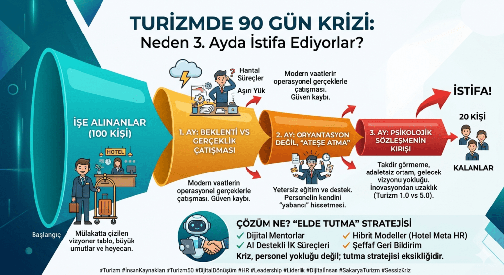 Turizm sektörü, emeğin yoğun kullanıldığı ve doğrudan insan etkileşimine dayalı yapısı nedeniyle personel devir hızının en yüksek olduğu alanlardan biridir. Literatürde “Sessiz Kriz” olarak nitelendirilen bu durum; sadece ekonomik kayıplara değil, aynı zamanda hizmet kalitesinde düşüşe ve kurumsal hafızanın zayıflamasına neden olmaktadır (Postolov ve ark., 2025). Bu makale, çalışanın işe girişinden itibaren geçen ilk 3 aylık süreci bir “risk alanı” olarak tanımlayarak, ayrılma nedenlerini bilimsel veriler ışığında analiz etmektedir.