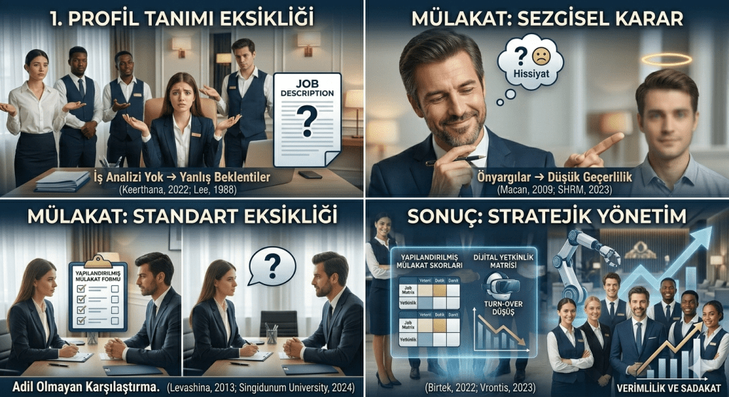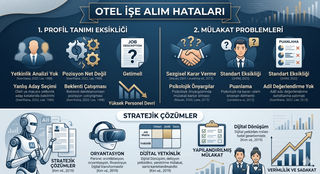 - Yetkinlik Analizi ve Haritalama Yetersizliği: Pozisyonun gerektirdiği teknik donanım (hard skills) ile davranışsal yetkinliklerin (soft skills) sınırları net çizilmediğinde, değerlendirme süreci yüzeysel kalmaktadır (Keerthana, 2022). Çağdaş otelcilik dinamiklerinde “duygusal zekâ” ve “çeviklik”, teknik tecrübeden daha kritik bir başarı faktörü haline gelmiştir (ResearchGate, 2026). Bu analitik temelin eksikliği, çalışan memnuniyetsizliğini ve hızlı işten ayrılma süreçlerini beslemektedir (Universiti Sains Malaysia, 2014).